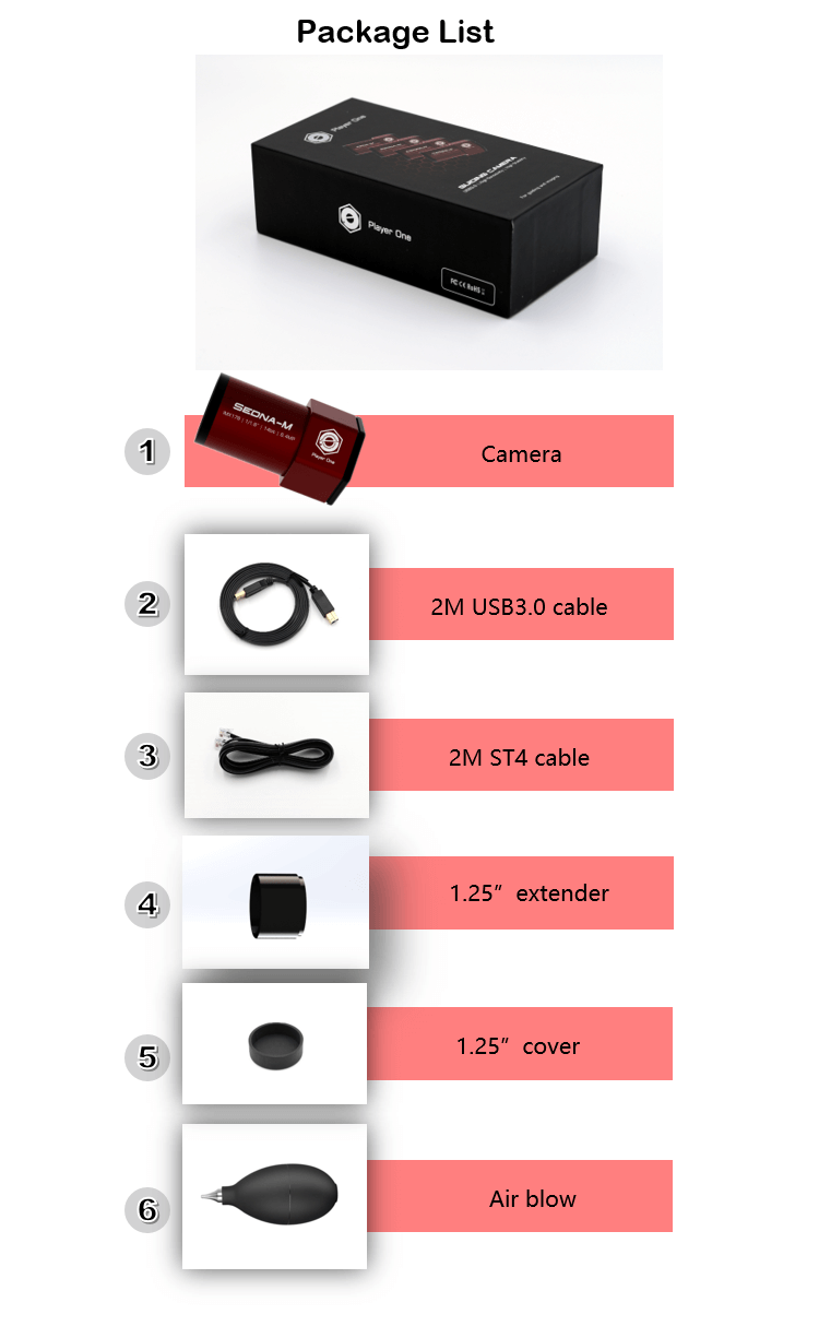 Sedna-M est une caméra guidée développée par Player One Astronomy, qui adopte le capteur de format Sony IMX178 1/1,8 ”. La taille de pixel 2.4UM peut accueillir une profondeur de puits de 15ke avec un total de 6,4MP (la résolution est de 3096 * 2078), et la diagonale est de 9 mm.
