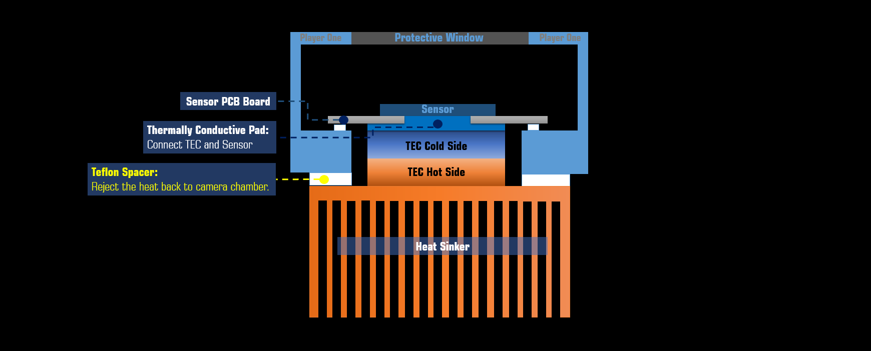 La série de caméras refroidies Player One utilise une unité de refroidissement TEC à 2 étages, après avoir amélioré la conception de la structure pour rejeter la chaleur dans la chambre de la caméra, la caméra Delta-T peut atteindre 35 à 40 ℃.