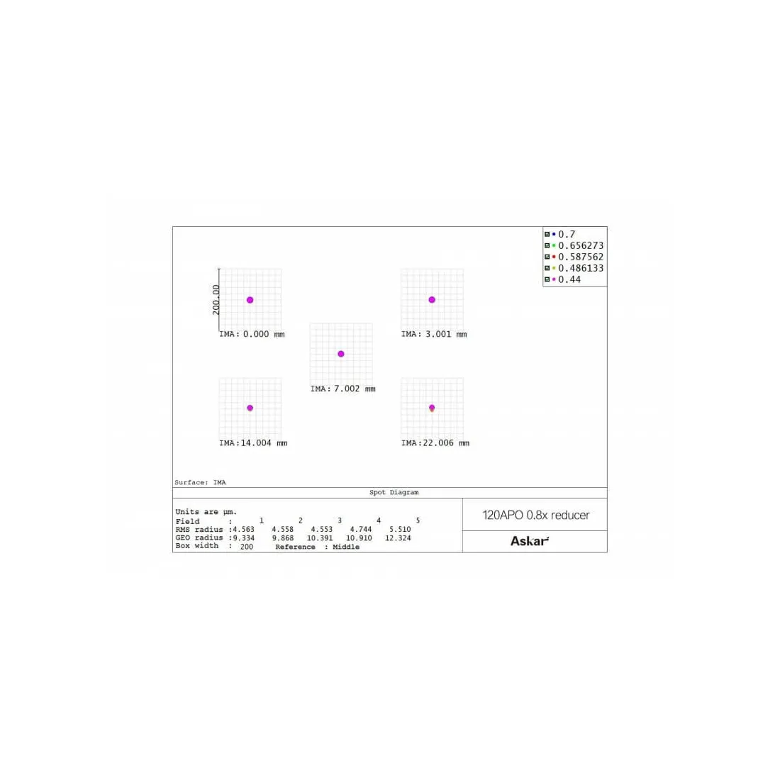 Réducteur de focale 0,8x optimisé pour l'Askar 120 apochromatique, qui réduit le rapport focal jusqu'à F/5.6 (672mm). Compatible avec d'autres tubes qui aurai les même caractéristiques. Il adopte une conception de triplet et prend en charge un cercle d'image complet de 44 mm.