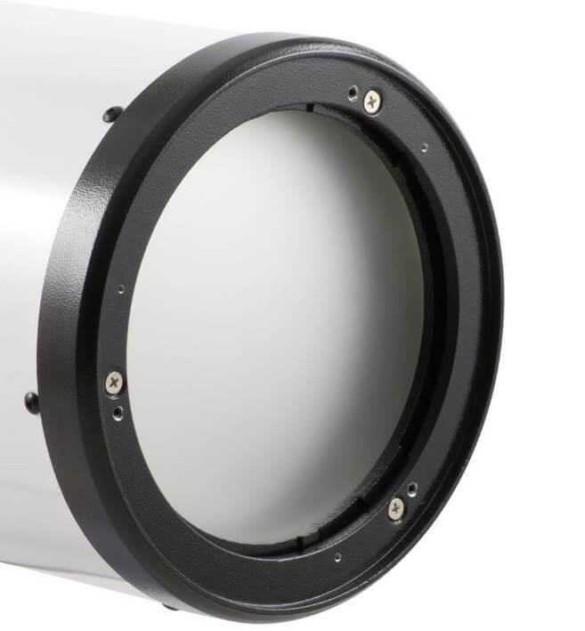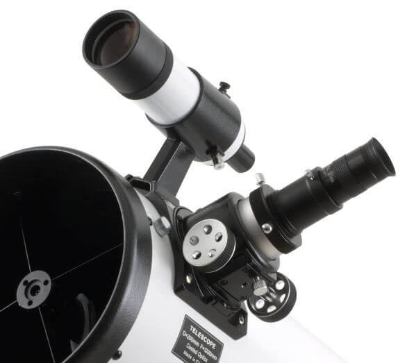 Le porte-oculaire en 50,8 mm, qui fonctionne tout en souplesse, est équipé d'une bague de réduction vers le format 31,75 mm. Le chercheur est doté d'un réticule fin et permet de trouver facilement même des objets peu lumineux.
