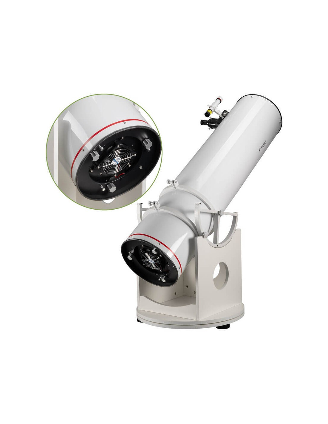 - Le tube optique est placé dans une paire de colliers pour tube qui,sur les côtés, reçoivent les grandes molettes d'élévation. Cela signifie que le tube peut également être utilisé sans aucun problème sur une monture équatoriale et qu'il peut également être tourné le long de son axe longitudinal afin de garantir la vision idéale dans n'importe quelle position. Il est possible, par décalage du tube dans les colliers, d'équilibrer le Dobson de façon optimale