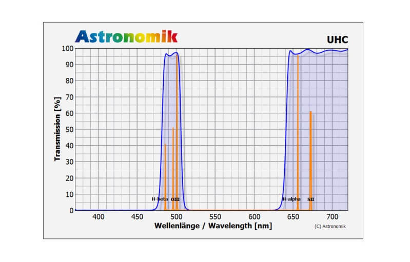Le filtre astronomique UHC permet une transmission de presque 100% de toutes les radiations des lignes OIII et Hbeta.Cependant, la seconde fenêtre de la ligne Halpha n'est pas prévue pour l'observation visuelle. C'est important à savoir si le filtre est utilisé avec un module électronique. Toutes les autres lumières dispersées sans intérêt et provenant des autres longueurs d'onde et contenant partiellement de la pollution lumineuse artificielle, sont arrêtées par le filtre de facon efficiente. Le fort blocage des rayonnements provenant du fond du ciel apporte une abondance inattendue de détails visibles dans les nébuleuses de gaz et les nébuleuses planétaires.