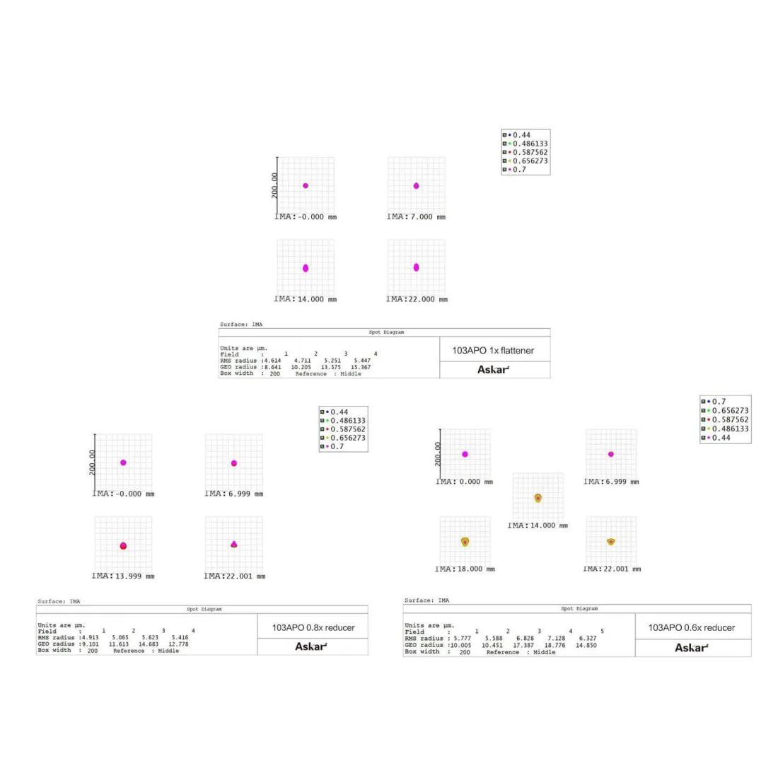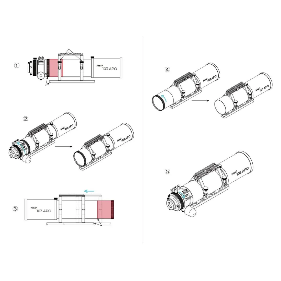 Le réducteur 0,6x peut amener le rapport focal de l'Askar 103APO jusqu'à f/4 tout en assurant également un aplatissement du champ. Askar 103APO adopte une conception de tube amovible, où la partie arrière du tube peut être retirée lors de l'utilisation du réducteur 0,6x, permettant au télescope d'avoir la longueur nécessaire pour atteindre un rapport focal f/4.