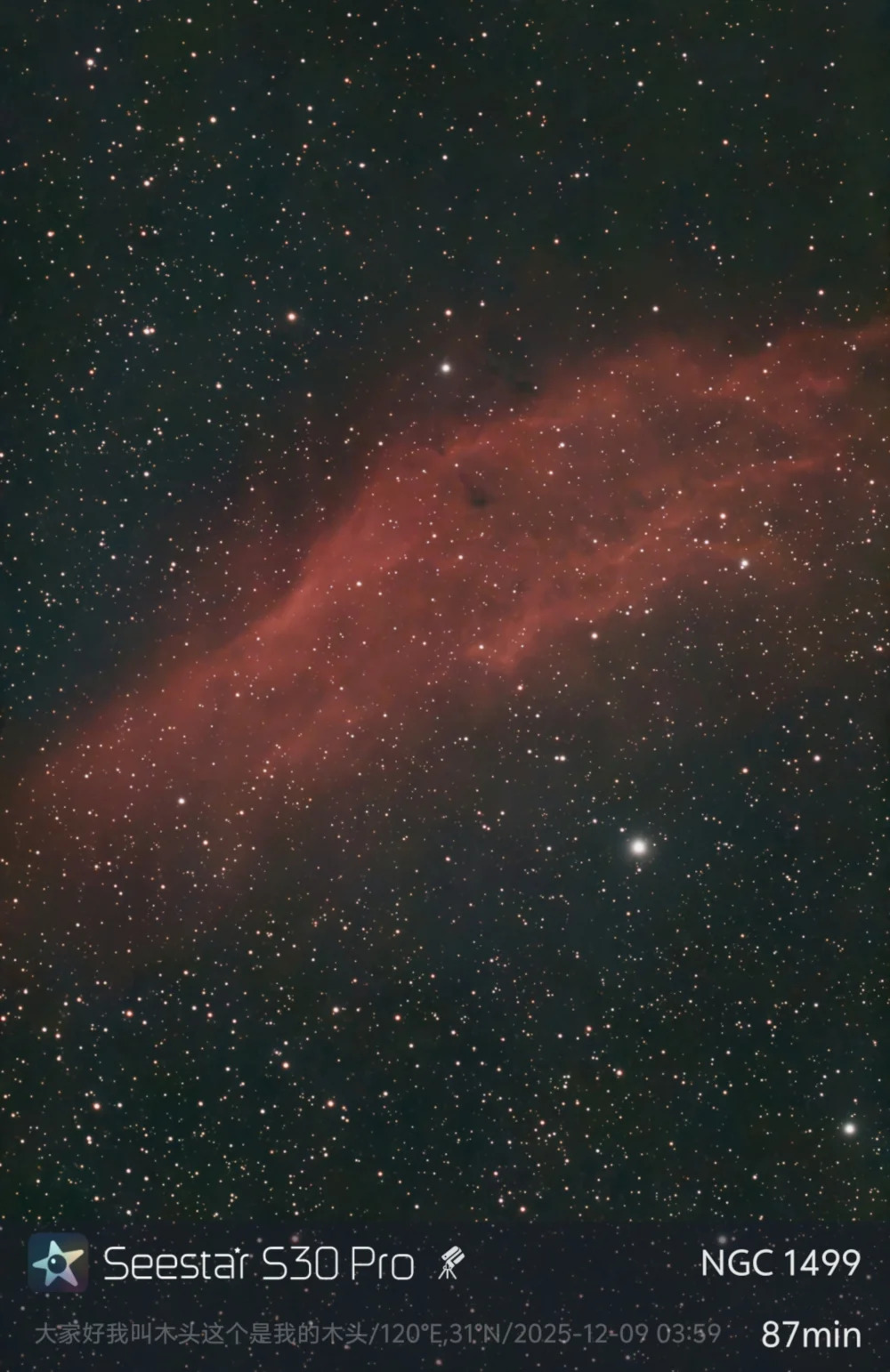 Nébuleuse California (NGC 1499) après 87min avec Seestar S30 PRO