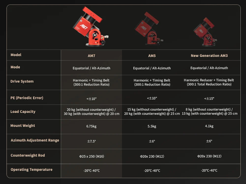 Compatibilité : ZWO AM7, ZWO AM5, iOptron GEM40/45, Rainbow Astro 135E, Skywatcher AZ-GTi