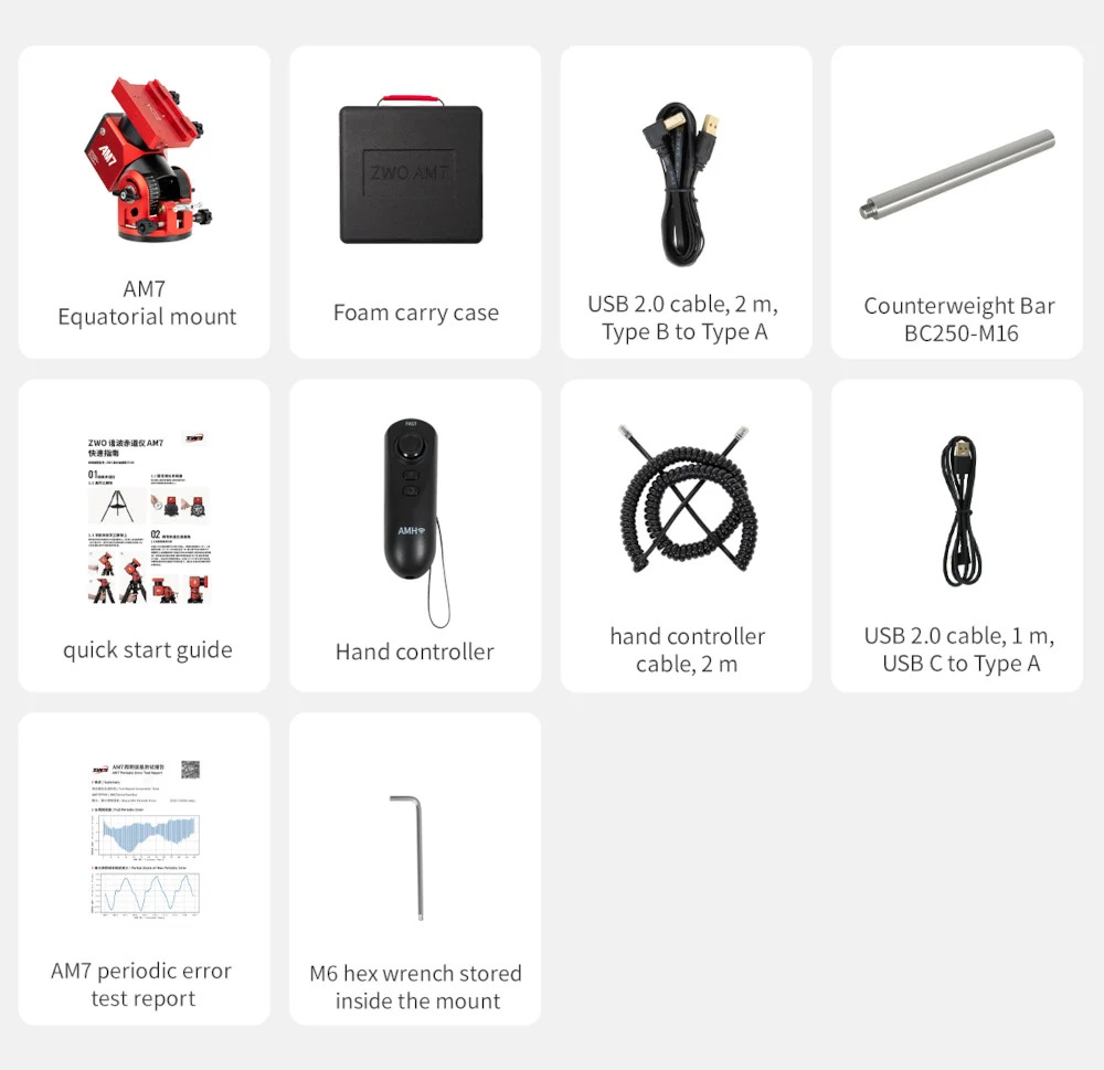 La monture ZWO AM7 dispose d'une motorisation double axe assurant le suivi, les déplacements et le guidage. Une raquette de commande à joystick est fournie. Elle dispose en outre du pointage automatique, réalisé par le biais de l'application sur smartphone ou par le biais de programmes tiers via un pilote ASCOM. La monture est pilotable soit par une connexion Wi-Fi intégrée, gérée par une interface web, soit par une connexion filaire, soit dorénavant en Bluetooth. La mise à jour des firmwares de la raquette de commande et de la monture est simple et facile.
