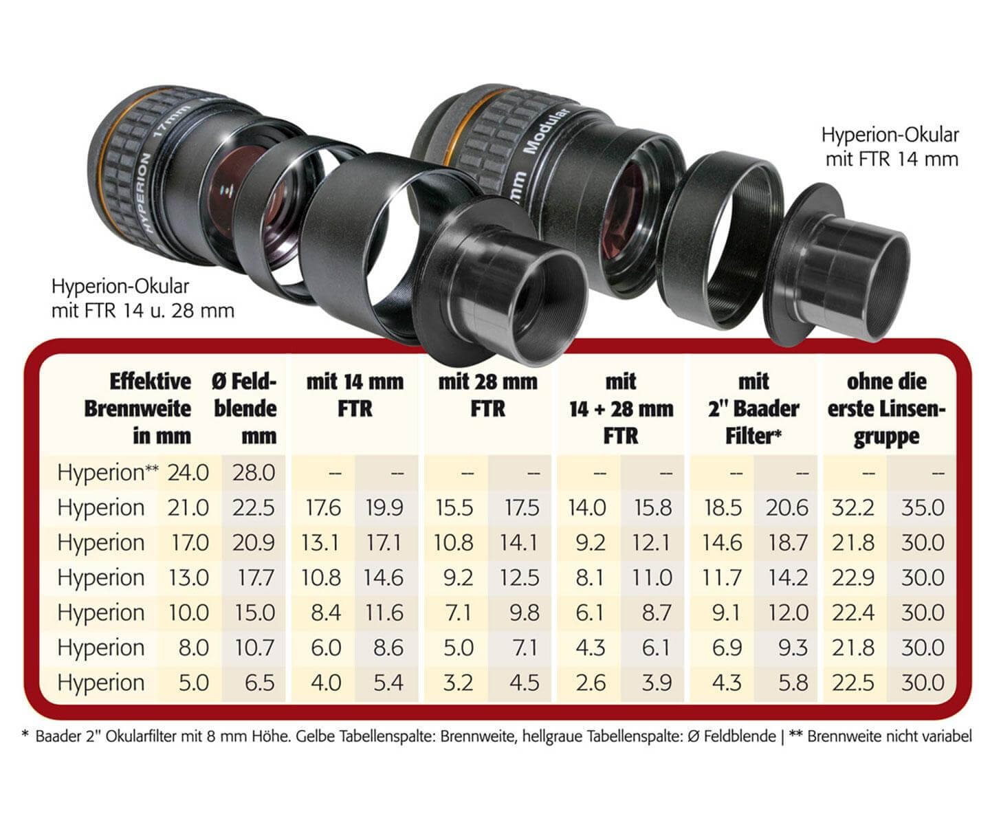 - La conception optimisée offre les meilleures performances possibles avec presque tous les télescopes. Avec les oculaires Hyperion, même les télescopes newtoniens rapides offrent beaucoup de joie, même pour les observateurs exigeants.
